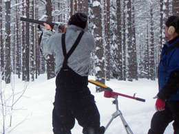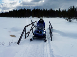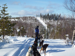 Snowmobile provide our guests with a completely different mode of winter transport. With their powerful engines they are a useful working tool here at the Border Inn - making trails and shifting people and equipment when our dogs are resting. They are also very fast and highly manoeuvrable! Driving techniques (and abilities!) vary greatly, but with patience you will gain a degree of mastery of their prestigious capabilities. If trail conditions and confidence allow you may reach speeds in excess of 100km/h. It can be just as challenging to weave your way through a tight forest trail at far lower speeds, or wade through deep snow with the correct use of balance and throttle. Great distances can be covered in only a few hours on the snowmobiles. A coffee break at an open fire provides views of the rapidly setting arctic sun in the west and Russia to the east. The return journey in darkness provides new challenges as your ability to judge speed and distance (and to see trees!) becomes impaired despite the best efforts of your snowmobile's powerful headlights. Sauna and dinner are waiting for you at the lodge - so drive carefully, there's always tomorrow! |
